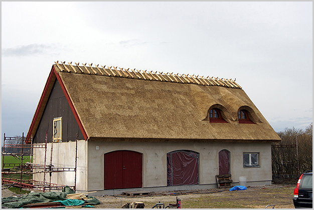 Nymölla, ett fristående garage med rundad kupa. Vasstaket ger helheten till gården.